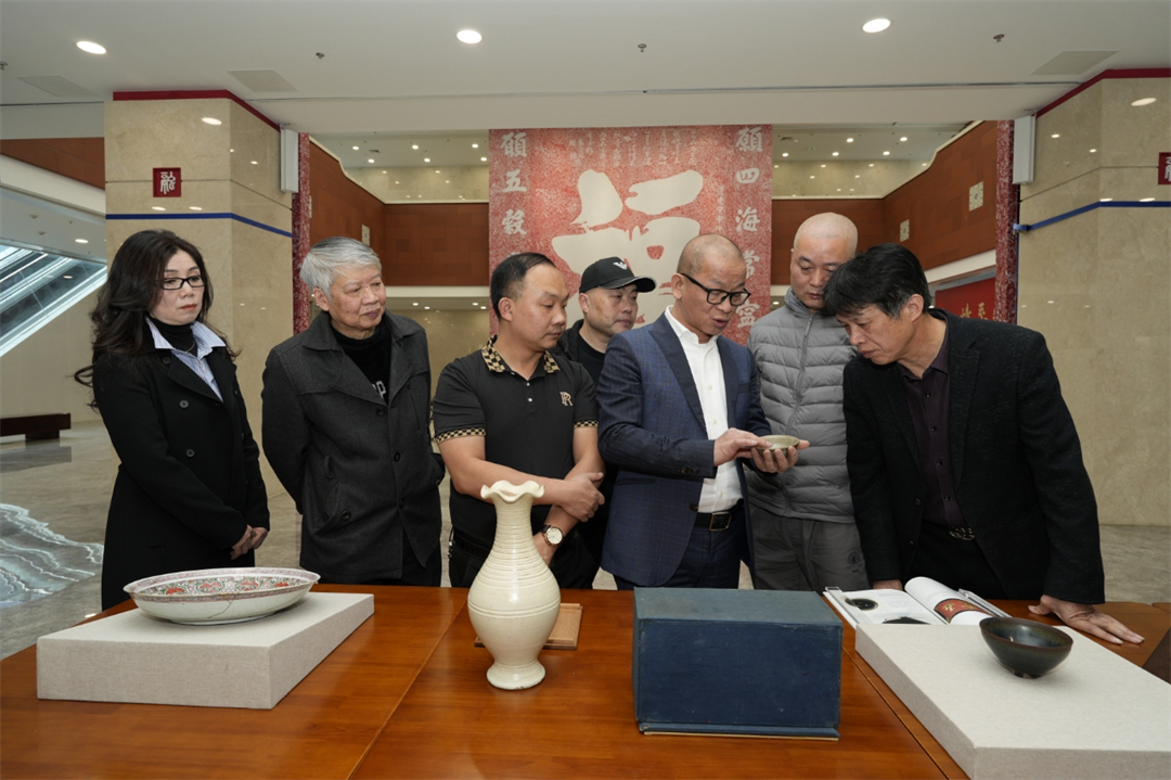 捐赠仪式现场,黄国梁先生详细讲解了这批文物。本次捐赠的文物有青铜熊、东晋越窑青釉鸡首壶、南北朝湘阴窑六系盘口壶、唐代黄釉三兽足鍑、龙门石窟菩萨半身像、宋供御型建盏兔毫茶盏、北宋耀州窑斗笠盏、宋磁州窑红绿彩内诗文茶碗、辽金时代百合口白瓷瓶、清初红绿彩三国人物故事图盘、明式硬木藤面南官帽椅、林则徐款硬木诗文书柜、清末民国钱同兴招牌,共计13件(套)。