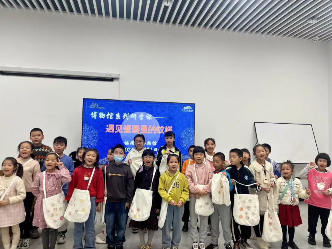 2024年12月1日上午,福清市博物馆策划的“博物馆系列研学课——遇见瓷器里的纹样”活动在培训厅顺利开展,活动让24名小朋友深切感受到了中国传统纹样的独特魅力,并让他们在现场动手实践,用植物染在布包上“复刻”了纹样。