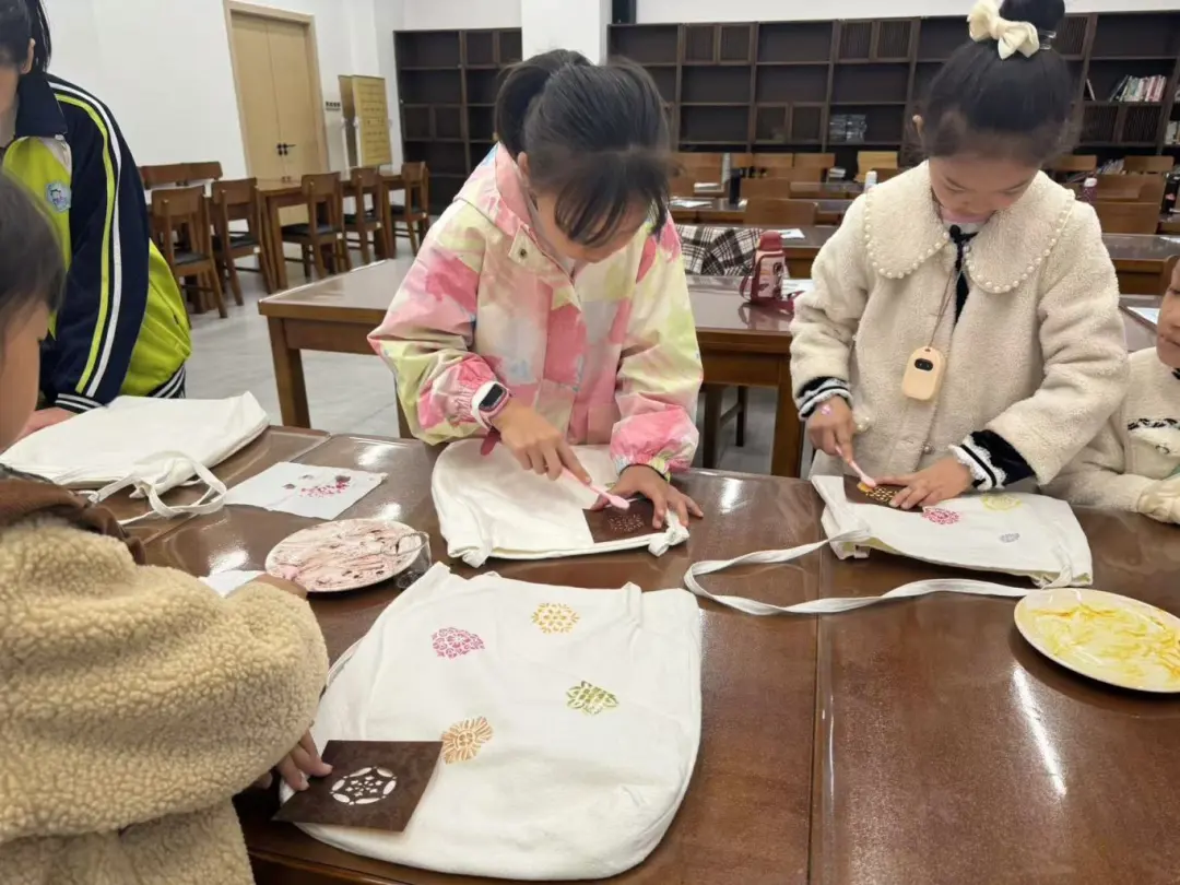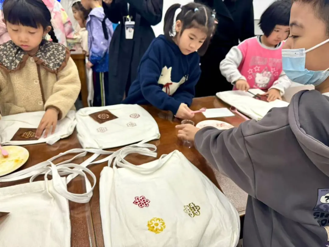接着,同学们通过现场材料进行自由创作。在现场工作人员的指导下,大家运用色浆、纹样模板、刷子等材料和工具进行制作。经过一番努力,一个个色彩斑斓、独具匠心的植物染布包在小朋友们手中诞生。