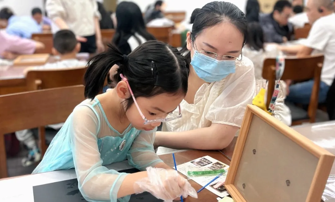 每个小朋友拿到材料后,在现场工作人员的指导下,大家运用笔、金箔、刷子等材料和工具进行烧箔画制作。通过上胶、贴箔、扫箔等步骤,体验烧箔画的制作工艺。经过一番努力,一幅幅精美的烧箔画作品在小朋友们的手中诞生。
