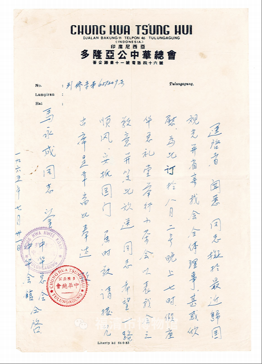 1965年7月31日印尼多隆亚公中华总会/中华会馆邀请马永成参加茶会的邀请信