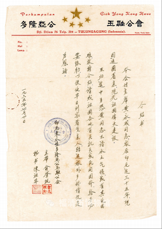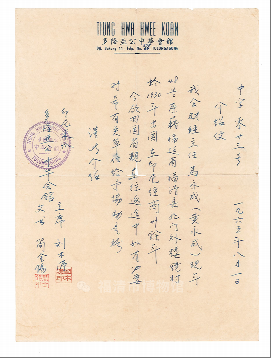 1965年8月1日印尼东爪多隆亚公中华会馆为其财经主任马永成(黄永成)归国省亲所开具的介绍信
